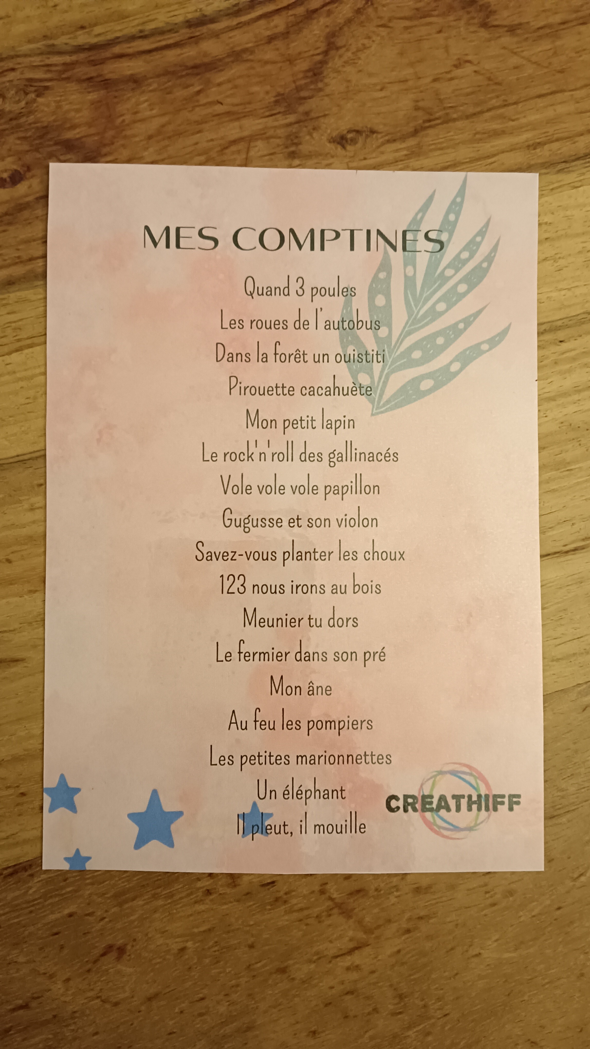 Ce lot est composé de 17 coussins à comptines de 10cm de côté en feutrine normes jouets EN71-3. Vous pouvez voir la liste sur la fiche produit.