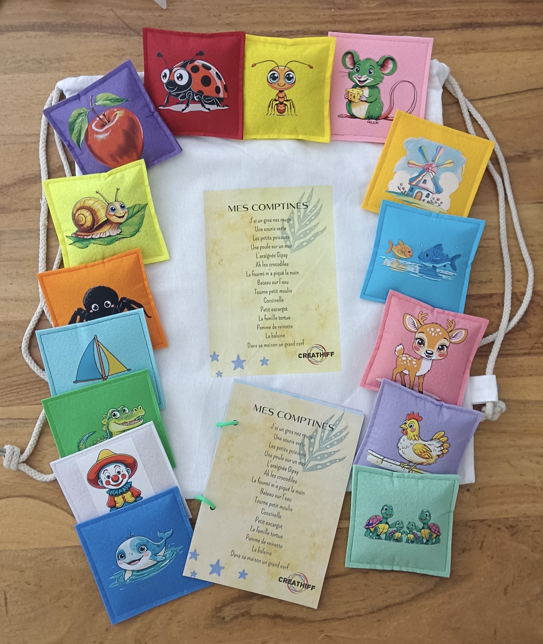 Ces coussins sont livrés dans un sac de rangement, et accompagné d'un livret de 15 comptines correspondants aux images plastifié et relié.