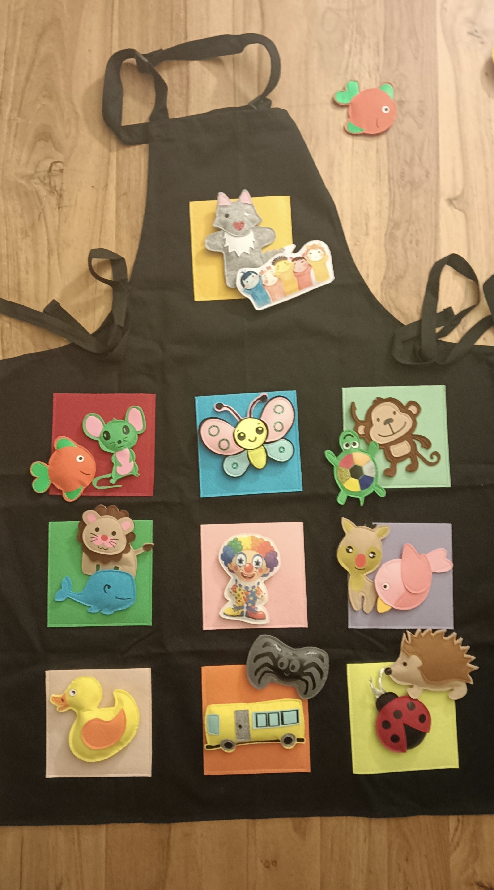 Tablier noire avec 10 poches en 13x13cm et 17 figurines à comptines.