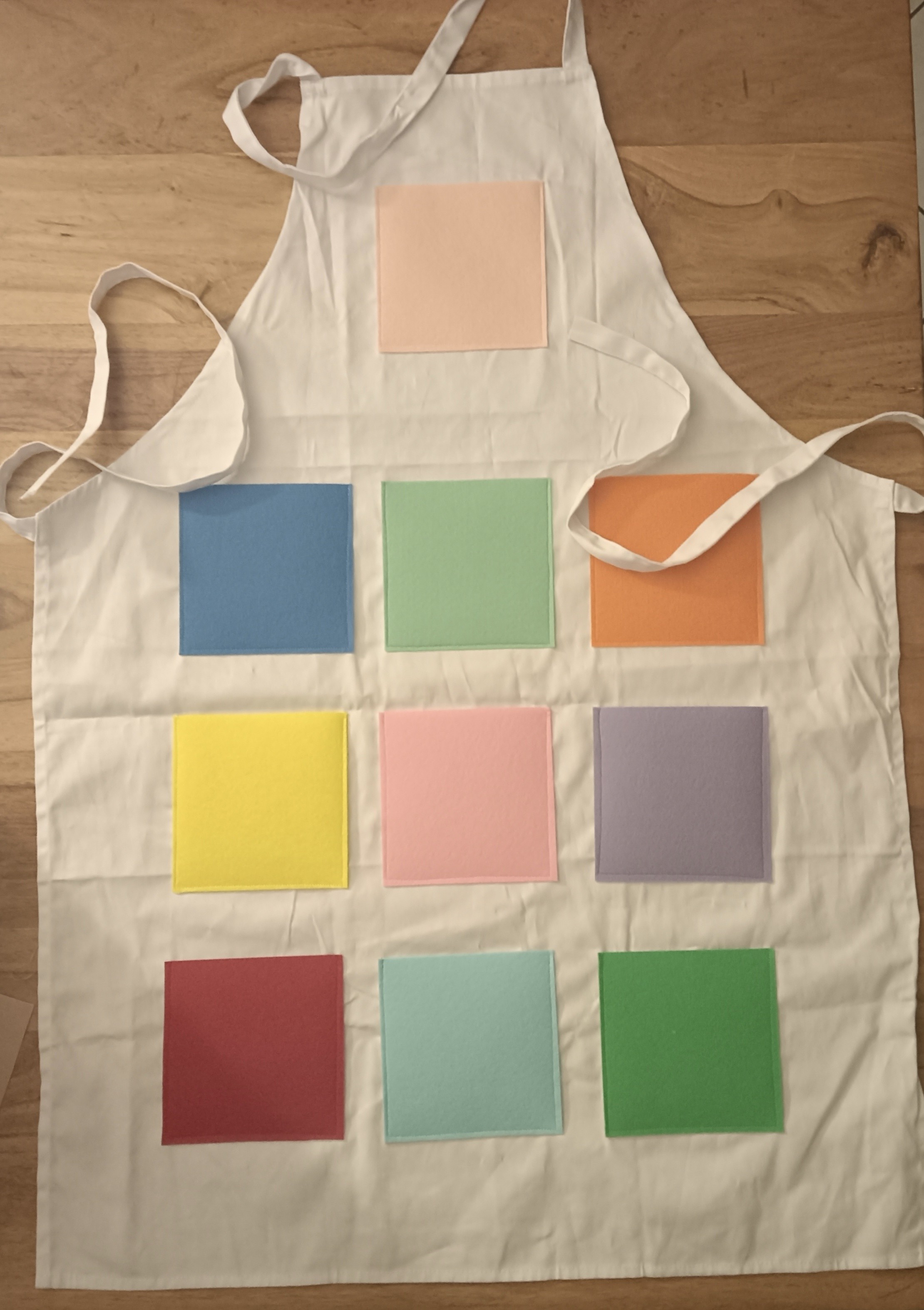 Tablier à comptines, avec 10 poches de 13x13cm en feutrine coréenne (ne bouloche pas et se déchire pas ).
